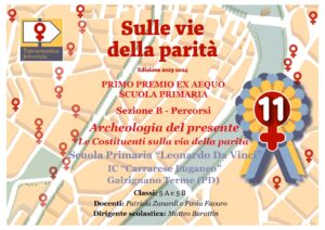 Le classi 5A e 5B della scuola primaria “Leonardo da Vinci” dell’Istituto Comprensivo “Carrarese Euganeo” di Galzignano Terme hanno recentemente ottenuto un prestigioso riconoscimento, vincendo il Primo premio dell’XI edizione del concorso nazionale “Sulle vie della Parità”, promosso dall’Associazione Toponomastica Femminile. Il progetto scolastico, presentato dalle due classi,