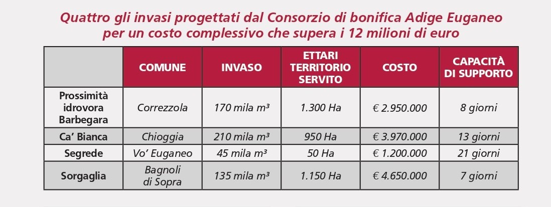 I cosiddetti “piccoli invasi” (sia collinari che di pianura) possono assolvere a molteplici funzioni a servizio dei Consorzi, delle imprese agricole e del territorio e contribuire alla positiva sinergia tra acqua, cibo ed ecosistemi. Verte su queste considerazioni il “Piano laghetti”, messo a punto da Ambi che punta a realizzare 10 mila invasi medio-piccoli entro il 2030, sufficienti ad aumentare di più del 60% la capacità complessiva dei serbatoi già esistenti sul terreno nazionale. Tra questi figurano anche le idee progettuali presentate dal Consorzio di bonifica Adige Euganeo, inerenti alla realizzazione di nuovi invasi, a scopo irriguo, realizzabili in prossimità dell’Idrovora Barbegara, nel comune di Correzzola; in località Ca’ Bianca di Chioggia, in località Sagrede nel comune di Vo’ Euganeo, lungo il canale Lozzo, e quello lungo il canale Sorgaglia nel comune di Bagnoli di Sopra per un volume totale d’invaso stimato in 560 mila metri cubi d’acqua a disposizione di una superficie complessiva di 3.450 ettari di campagna.