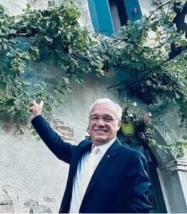 Giorgio Borin davanti alla “Dorona” la vigna che da due secoli è incastonata nel muro dell’ex osteria Al guerriero, vicino alla tomba del Petrarca in piazza San Marco ad Arquà