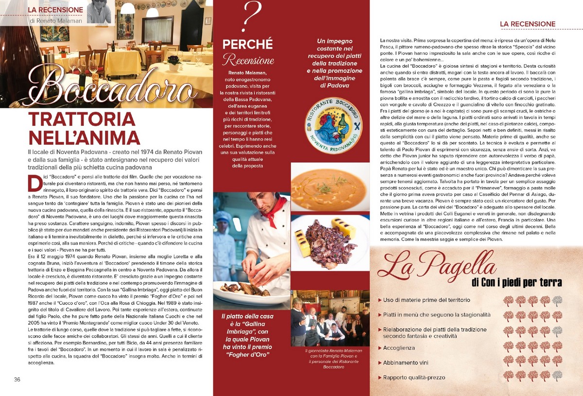 Alla quadriennale rassegna di Con i piedi per terra, dunque dopo i nomi del ristorante La Torre di Monselice, dell’Hostaria San Benedetto di Montagnana e del Ristorante La Montanella di Arquà Petrarca, vincitori delle scorse edizioni, è stato aggiunto quello di Boccadoro grazie ad un premio che ci auguriamo serva a mettere in luce chi ama la propria terra e attraverso il proprio talento ne diffonde il valore.