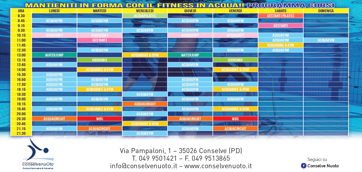 L’arrivo della bella stagione porta a scoprire di più il corpo e magari a mettere in evidenza qualche inestetismo, ma ritrovare il giusto tono della muscolatura non è mai stato così facile grazie ad una serie di attività fitness in acqua che Conselve Nuoto propone per diversificare il proprio calendario di attività: dall’Acqua Gym all’Acqua Bike, dal Water Jump all’Hidromix e poi corsi per gestanti, ginnastica dolce per anziani e pilates in acqua