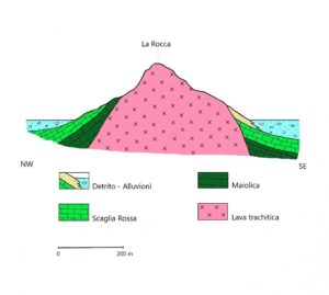 La Rocca di Monselice, il grafico riassume la sua conformazione e geologia. Si noti che la componente trachitica, sulla sommità, fuoriesce completamente dall’antico fondo del mare composto dalla scaglia rossa e dalla maiolica