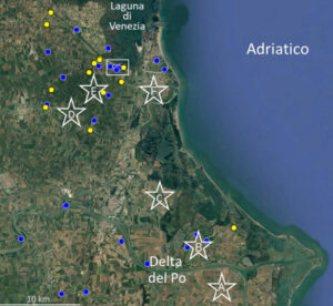 d’acqua (gialli). Le stelle indicano le posizioni dei nuovi super-siti: (A, B) Porto Tolle, (C) Porto