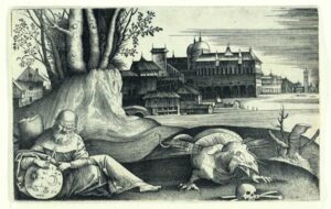 Nell’incisione Giulio Campagnola inserisce la data 1509 sulla sfera dell’astrologo, è l’anno della guerra di Cambrai che devastò il Veneto